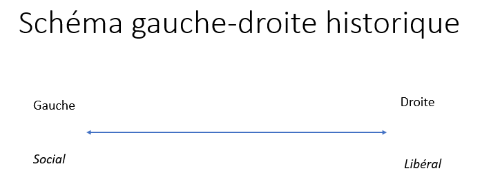 Ceci étant posé, résumons graphiquement la manière dont le débat politique a été positionné depuis mon enfance. Vu qu’il n’y a que la gauche et la droite, même s’il y a des extrêmes et quelques axes particuliers comme l’écologie qui n’est pas tout à fait sur la même ligne, le tout se résume à un schéma essentiellement monodimensionnel :