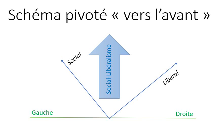 Pour conclure, je finirais en proposant une version « pivotée » de ce schéma, qui permet d’encore mieux retenir visuellement le choix politique qu’il porte, à savoir une ligne tournée vers l’avant (oserais-je dire vers l’avenir ?), en équilibrant « au mieux » l’axe social et l’axe libéral.